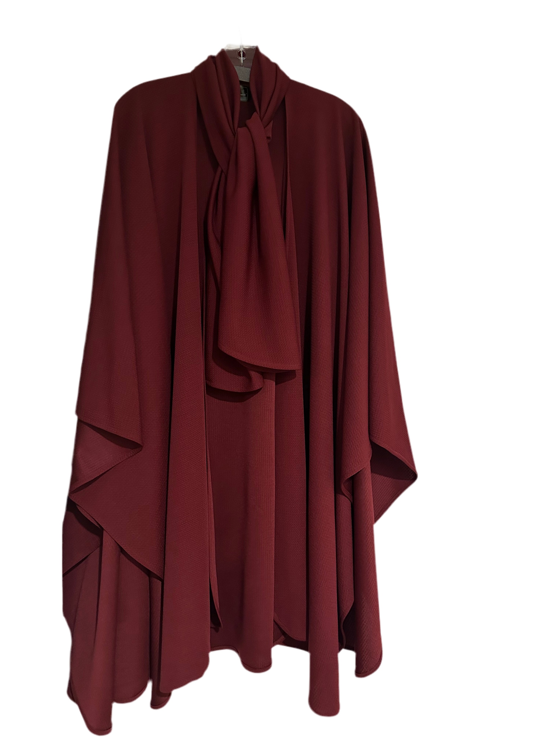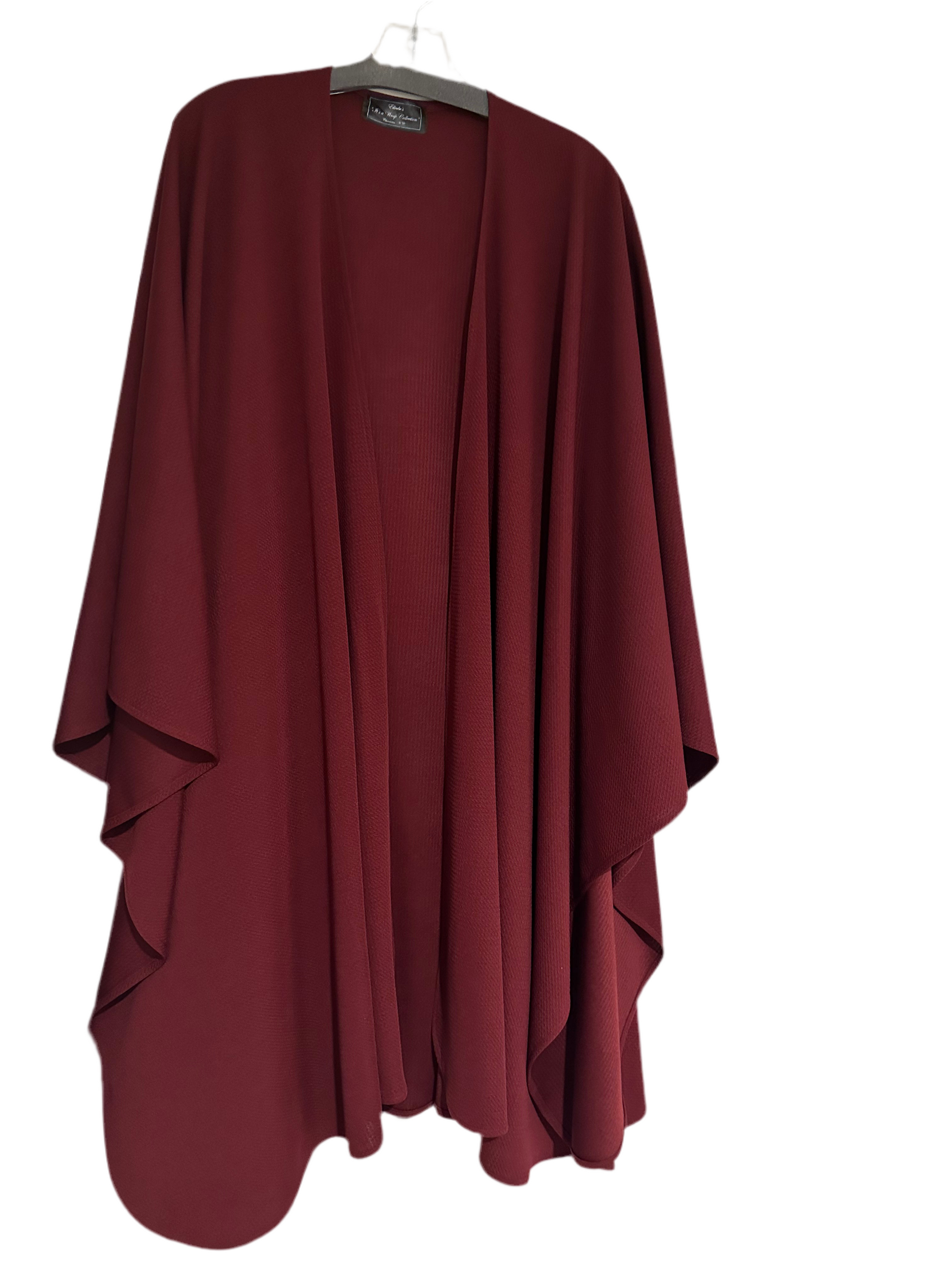 Medium weight textured polyester classic wrap with detachable signature matching scarf. Travel friendly. Delicate wash